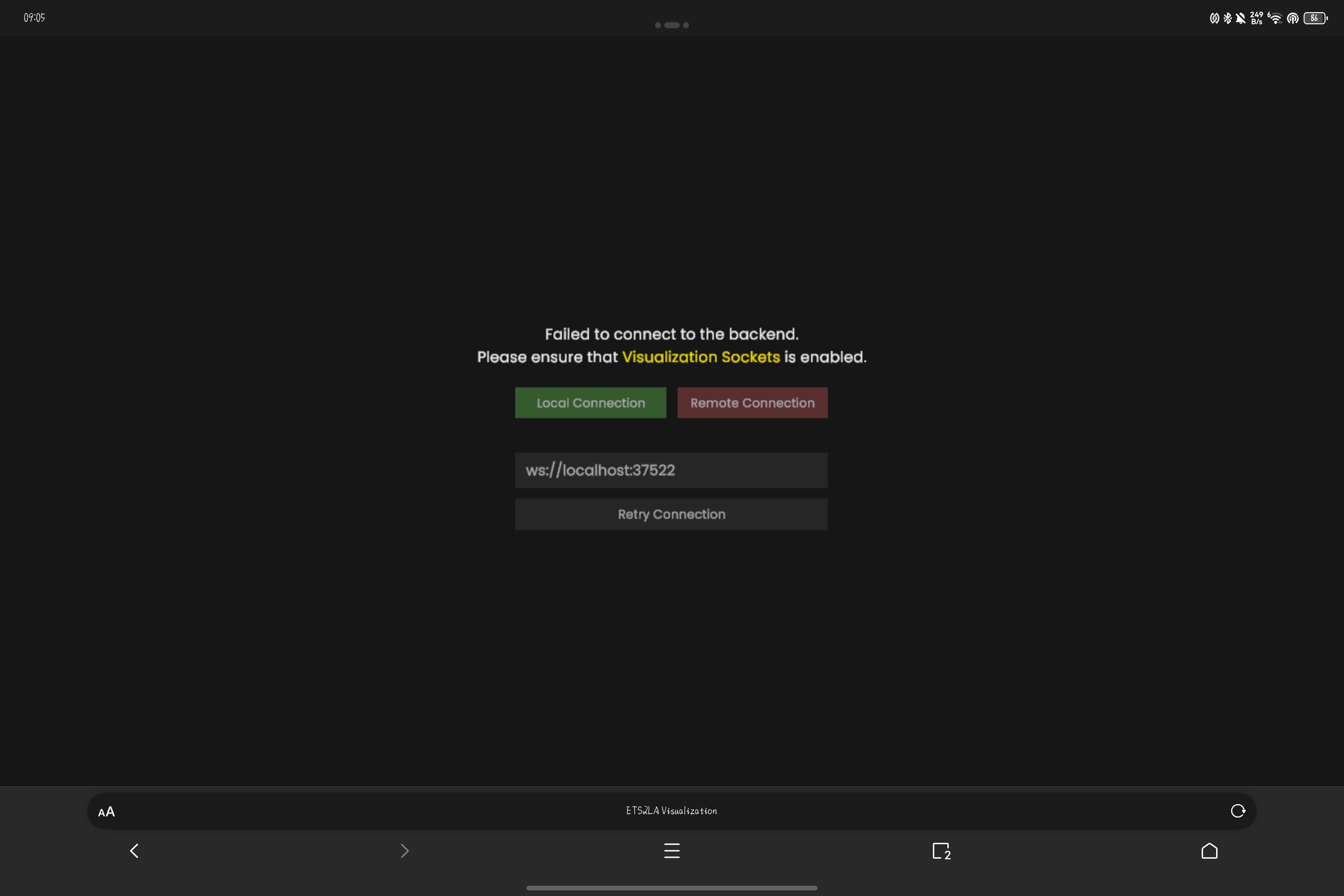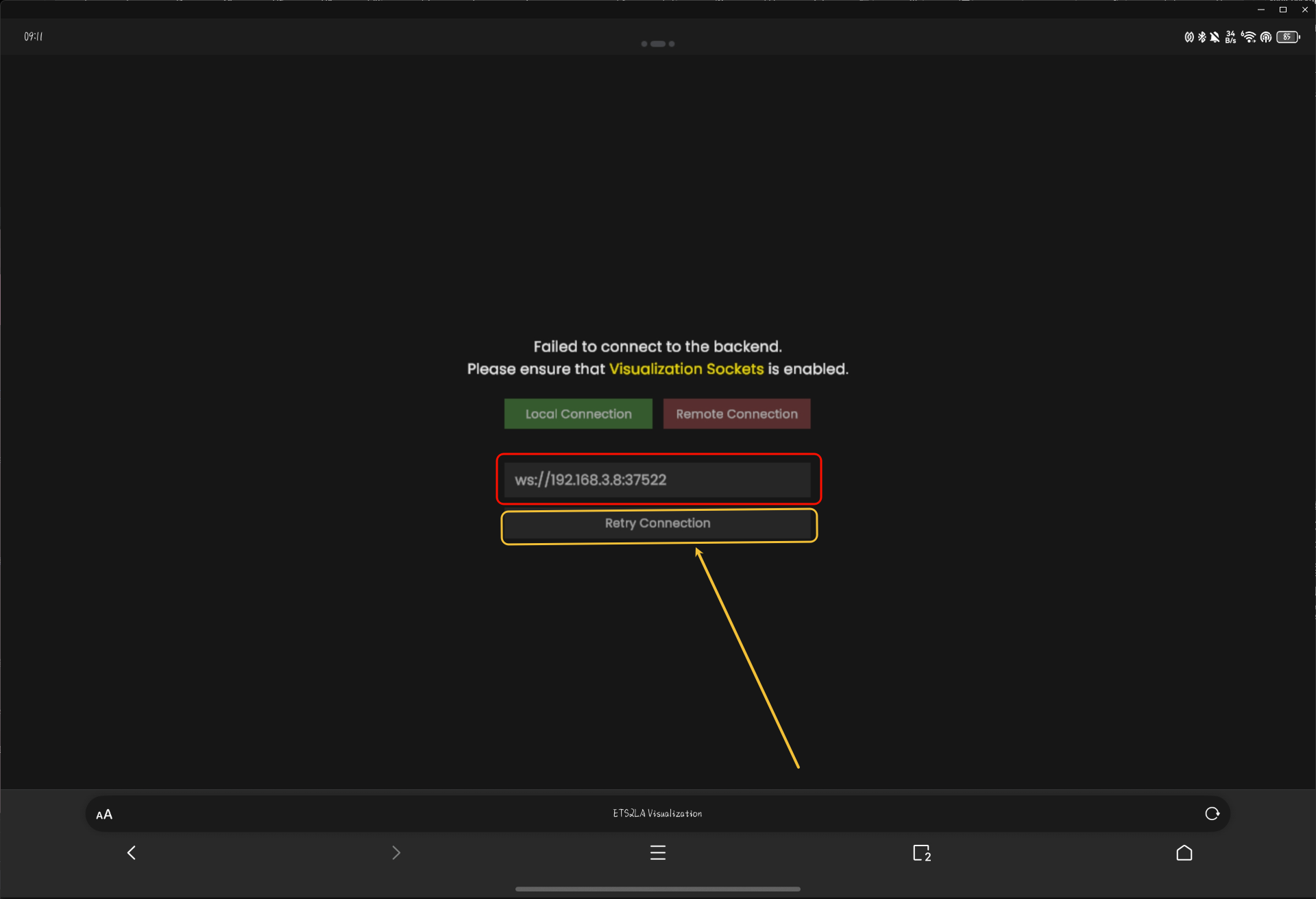不要慌张,将从ETS2LA设置中看到的ip信息(192.168开头的,我这里是192.168.3.8:37522)填入到方框中(保留开头的ws://),然后点击 Retry Connection,即可通过手机/平板查看环境可视化内部,像这样。