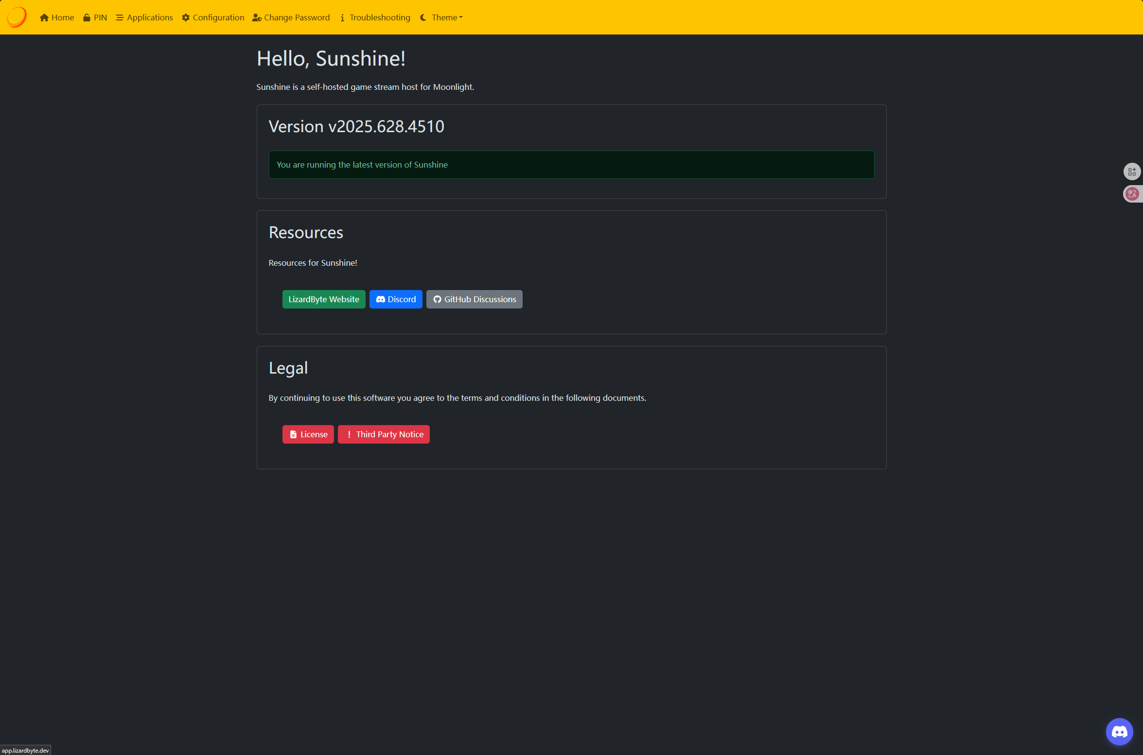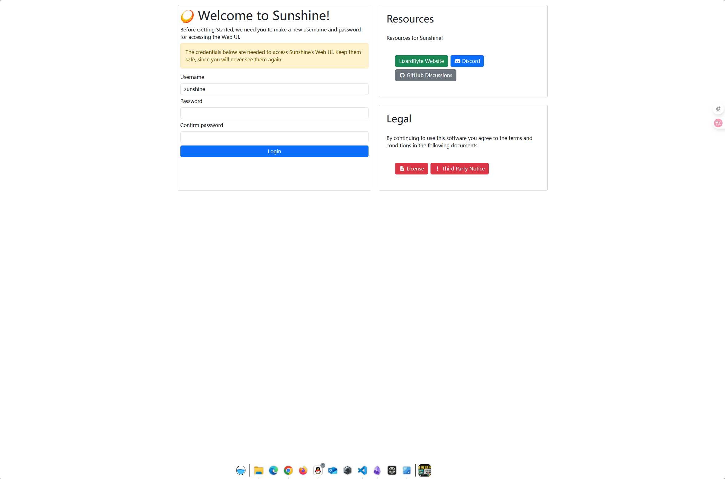 安装完Sunshine之后,我们打开浏览器并在地址栏中输入 https://localhost:47990 或者右键任务栏中Sunshine的图标,并选择 Open Sunshine 即可在浏览器中看到Sunshine的欢迎页面。