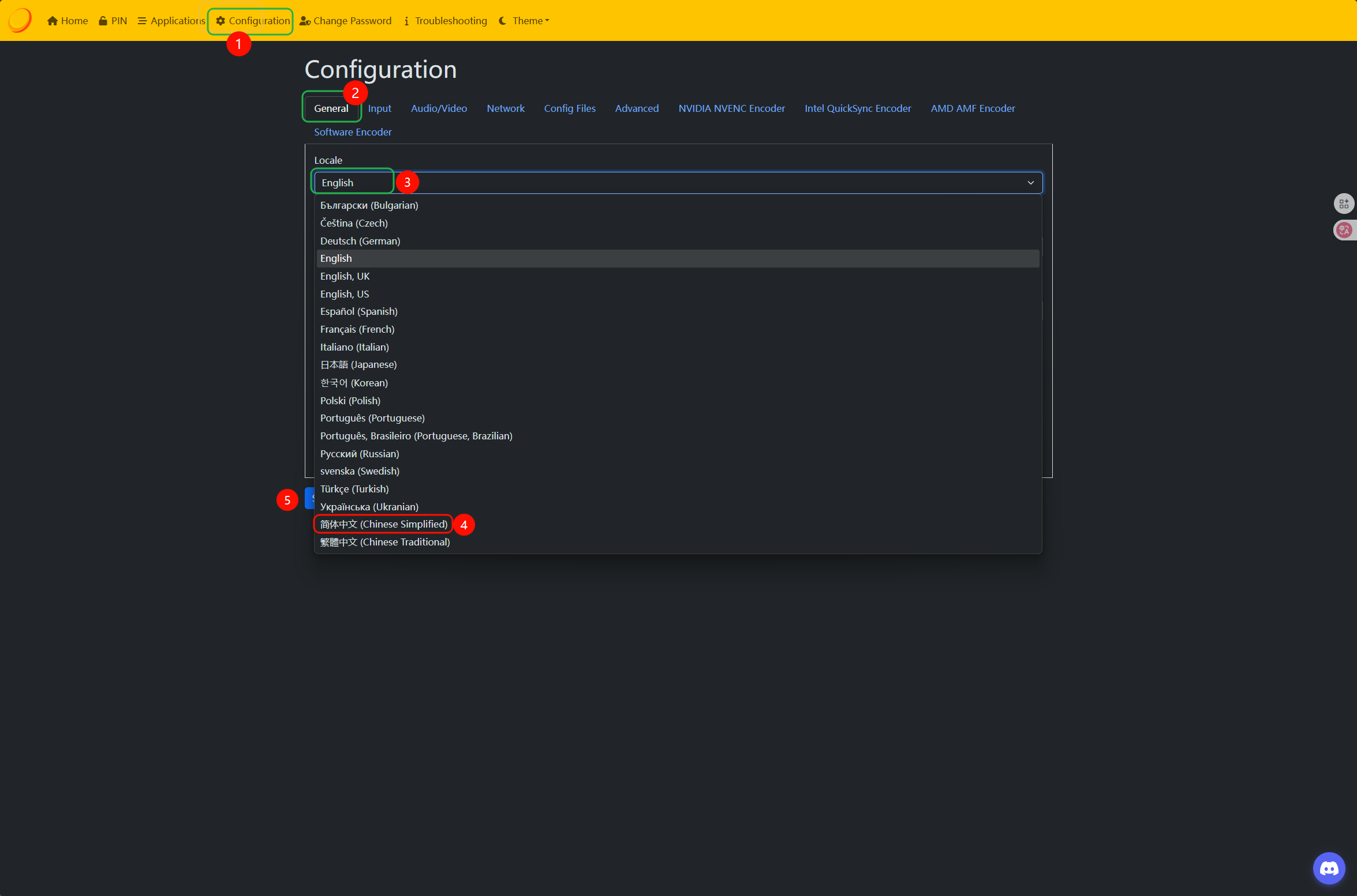 点击顶部的 Configuration ,在 General 选项卡中点击 Locale ,下拉找到 简体中文 ,然后点击🟦的 Save 保存设置,最后再点击🟩的 Apply 或在任务栏中右键Sunshine的图标并选择 restart 之后按住 Ctrl+Shift+R来刷新页面。