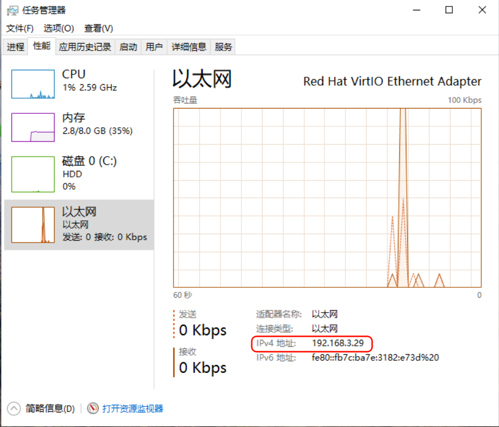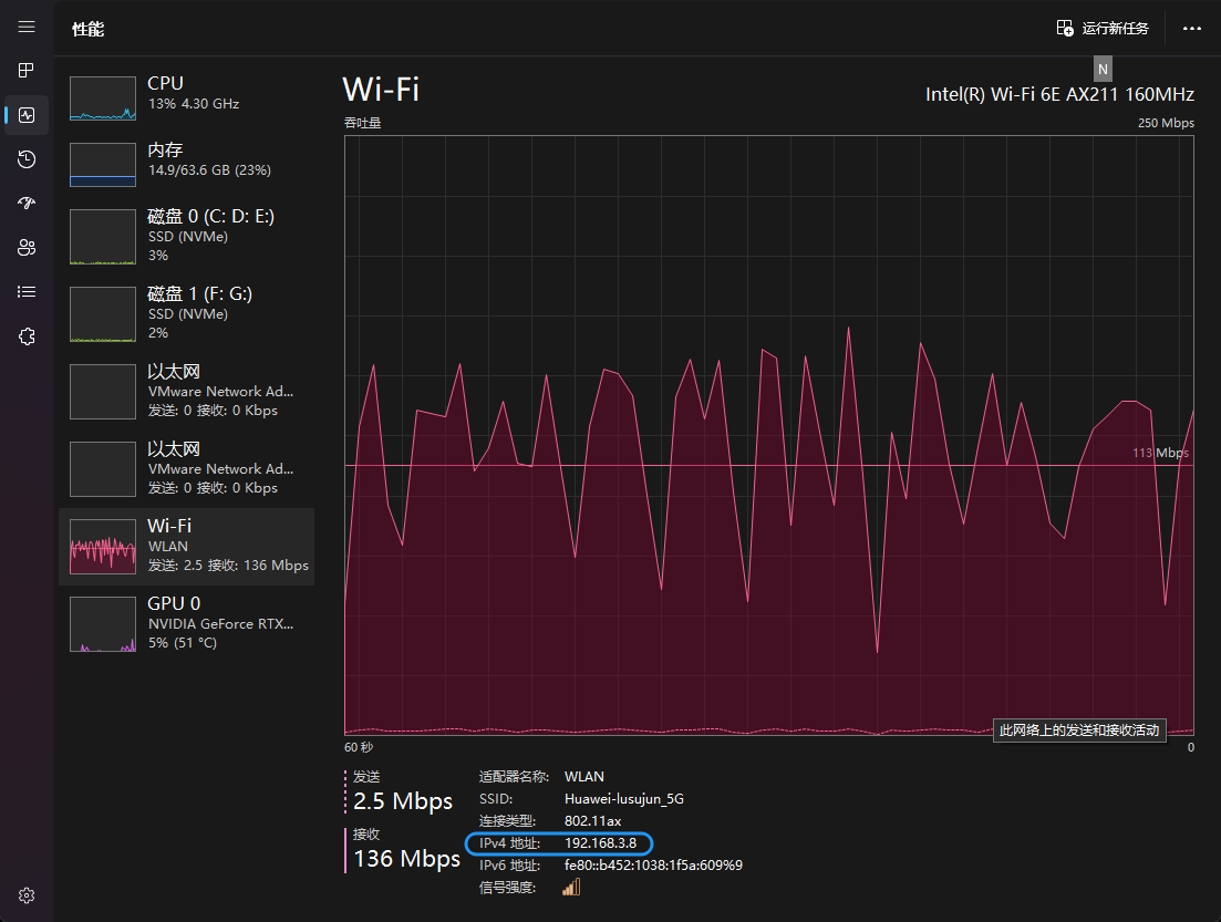 要想使用Moonliht连接上Sunshine,我们需要先知道电脑的局域网ip地址是多少,最简单粗暴的方式就是通过查看 Windows任务管理器中以太网/Wi-Fi中显示的ipv4 地址后面的内容即可得到,如图: Windows 11