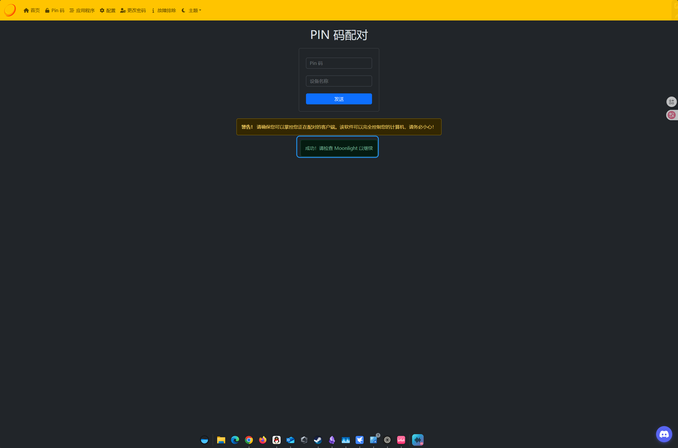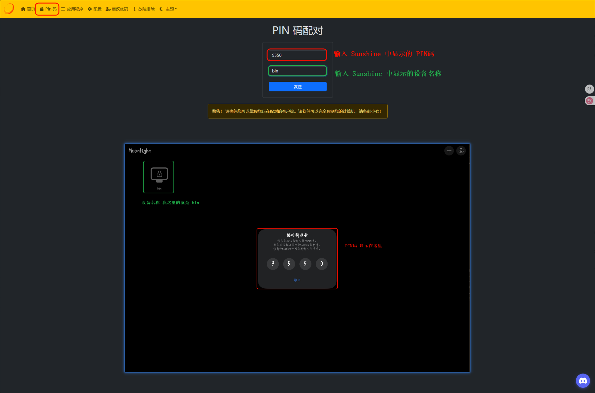 点击电脑的设备名称,会提示 配对新设备 让我们输入PIN码,这时我们回到Sunshine的网页,点击顶部的PIN码 ,我们输入设备上显示的PIN码以及 Moonlight中显示的设备名称。