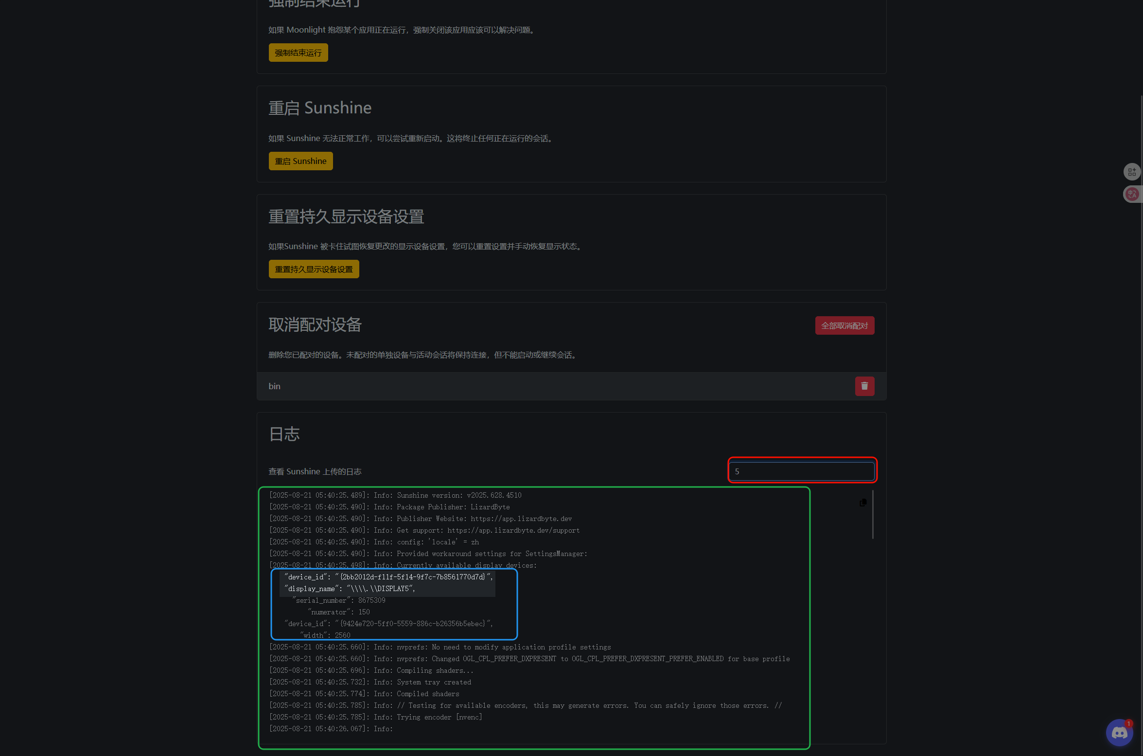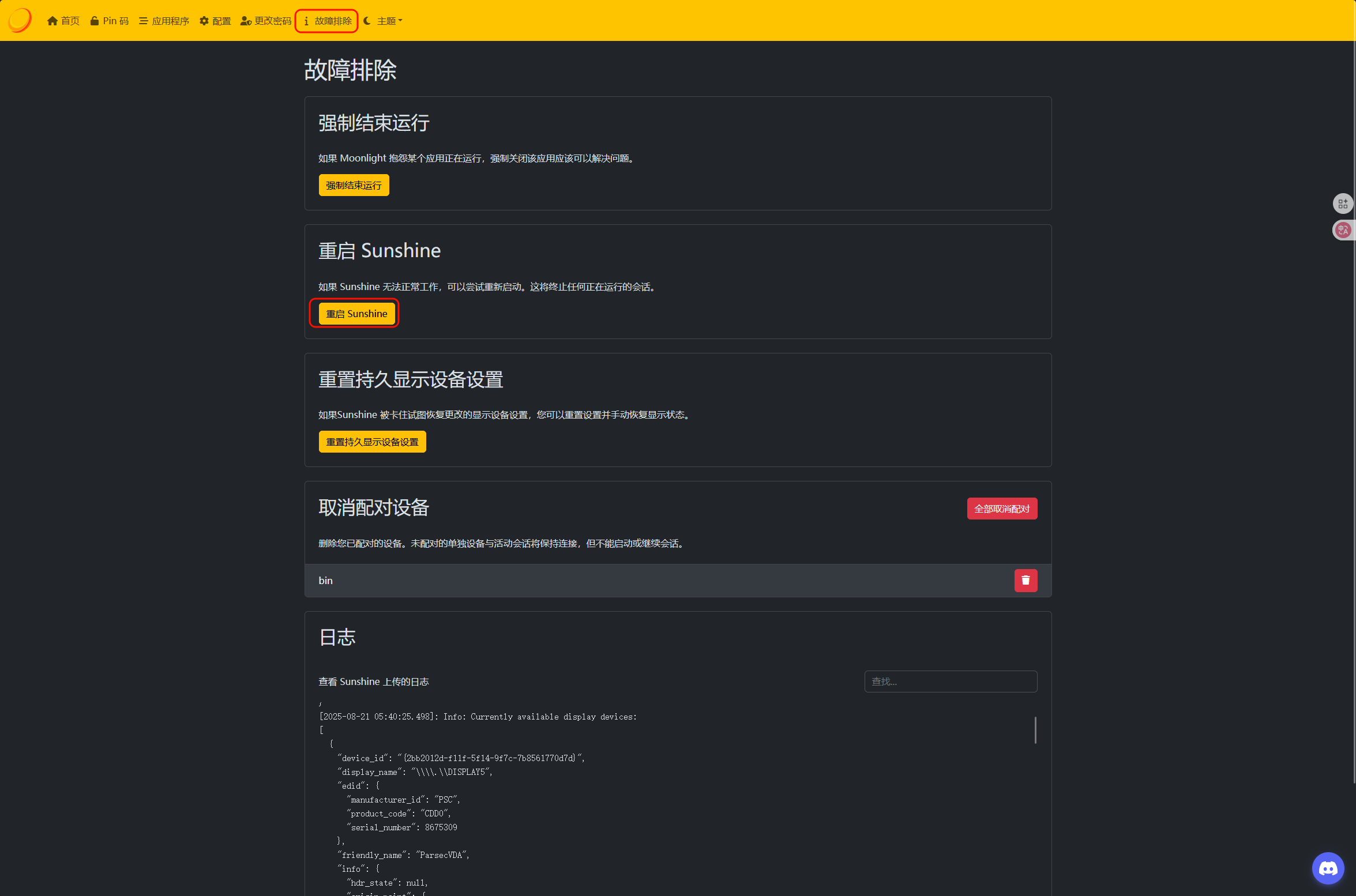 在配置好 ParsecVDisplay 之后,我们回到 Sunshine 中,选择最上方的故障排除,点击重启 Sunshine;
