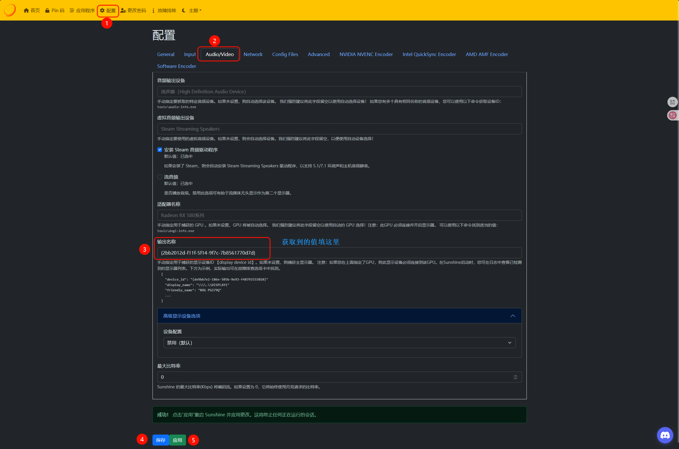 点击 Sunshine 顶部中的 配置 ,再选择 Audio/Vedio ,将上面复制的 device_id 的值填入到 输出名称中 ,点击保存,然后再点击应用,等待 Sunshine 完成重启。