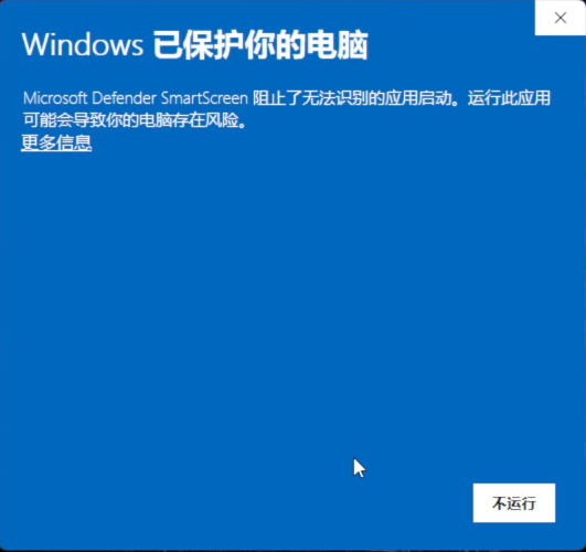 双击运行刚才下载的安装程序,可能会出现Windows defender的提示,直接点击更多信息,展开之后选择仍要运行即可。