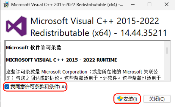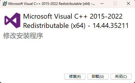如果你双击打开C++ runtime的安装程序是这样的,这表明你已经有了基础的环境,直接点击 关闭即可。