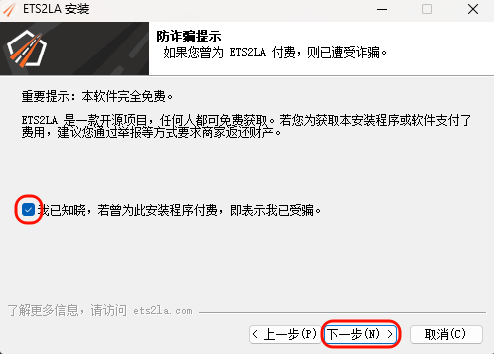 勾选我已知晓,若曾为此安装程序付费,即表示我已受骗并点击下一步