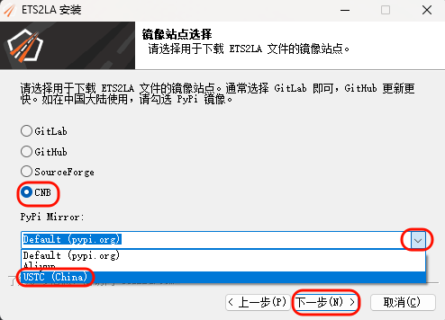 仓库地址选择CNB,Pypi Mirror选择USTC或Aliyun,然后点击下一步