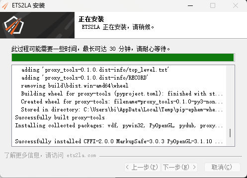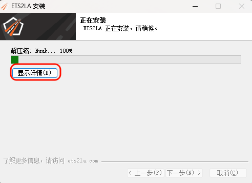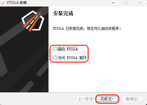 安装完成后取消勾选启动ETS2LA,然后点击完成