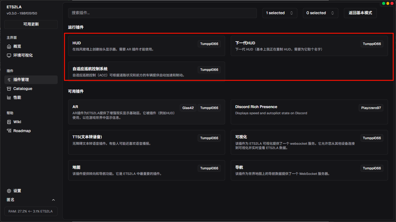 反观高级模式的逻辑就很清晰,点击哪个插件就启用哪个插件,根本没有选择一说,这里简单举个例子,自适应巡航控制系统、HUD两个插件是勾选上的,现在再随机点击一个插件他就会在上方的运行插件中显示(我这里点了下一代HUD)