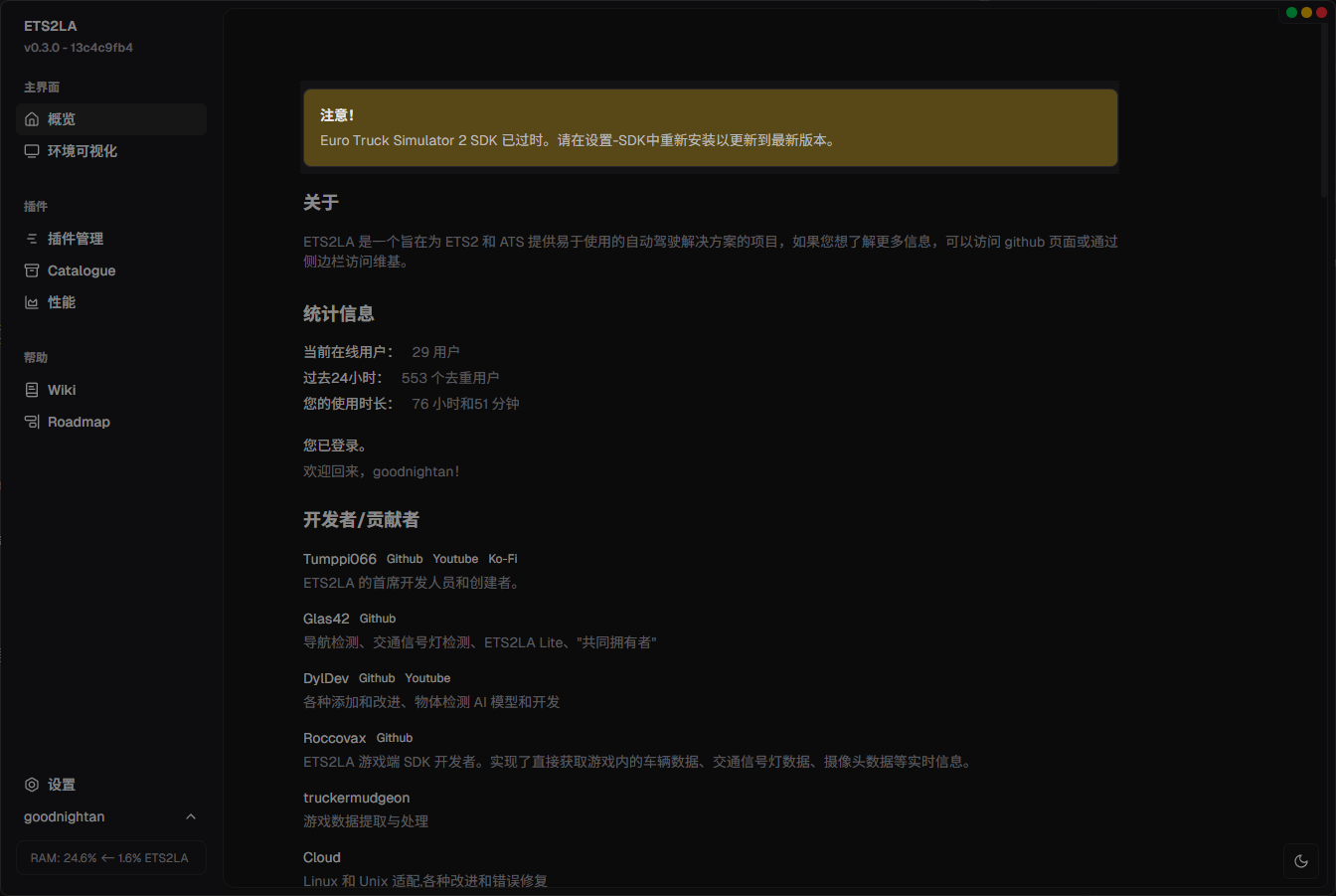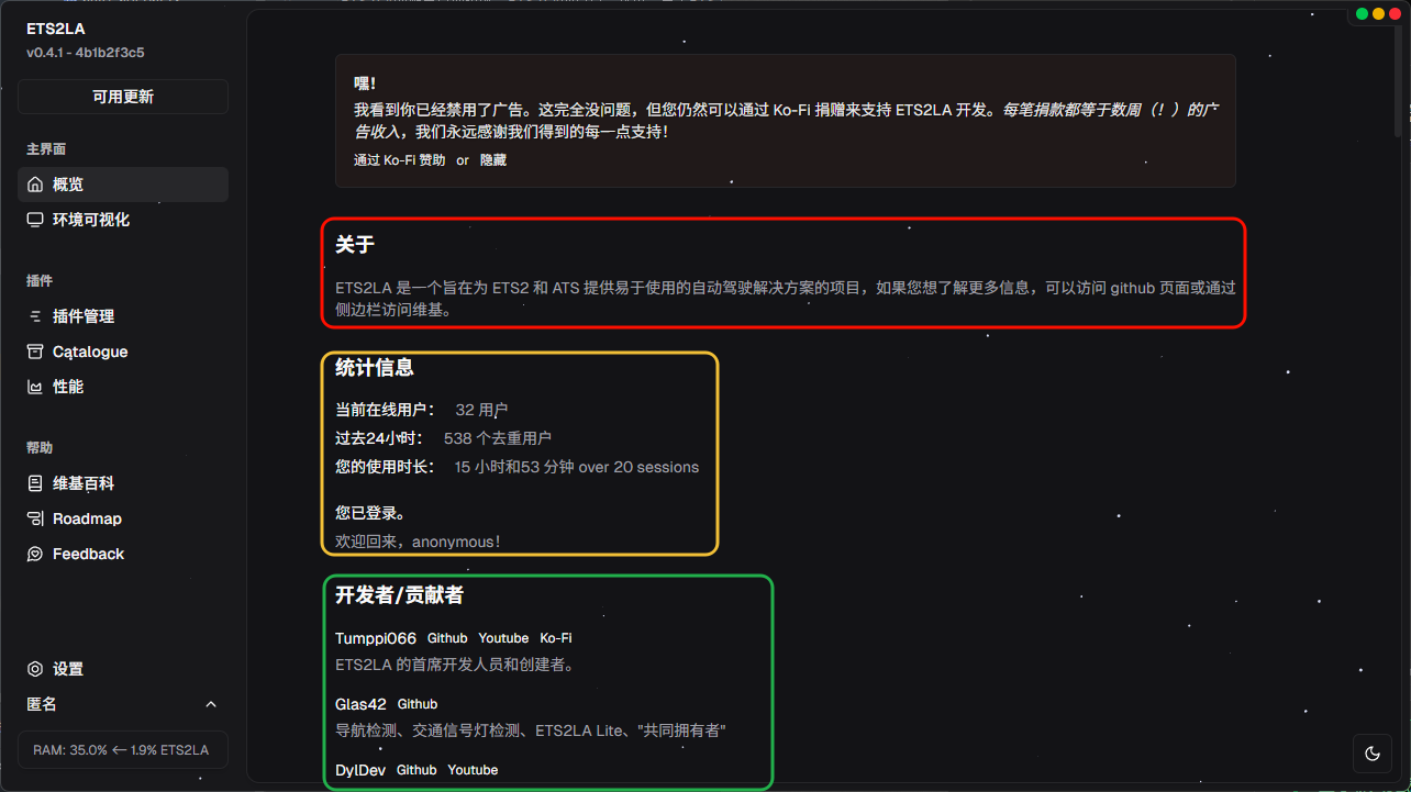 ETS2LA的概览页面也就是ETS2LA的首页,这里会显示ETS2LA的介绍(红框内)、数据统计(黄框内)、开发者/贡献者(绿框内)、支持语言以及一些实用程序