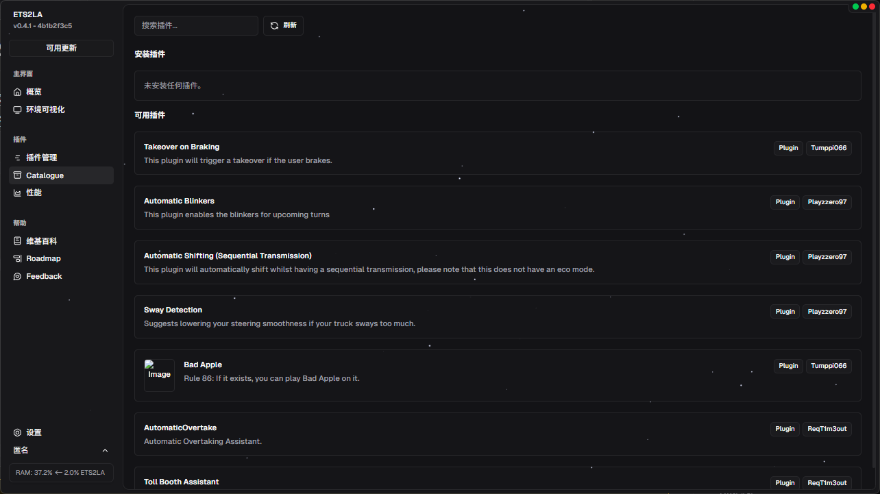 这个页面的主要是一些第三方作者开发的适用于ETS2LA的插件,页面会通过检索GitHub上的文件来加载这个列表,点击最上方的刷新可以手动刷新可用插件的列表