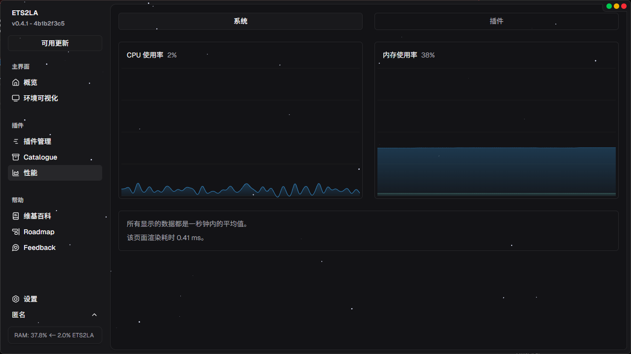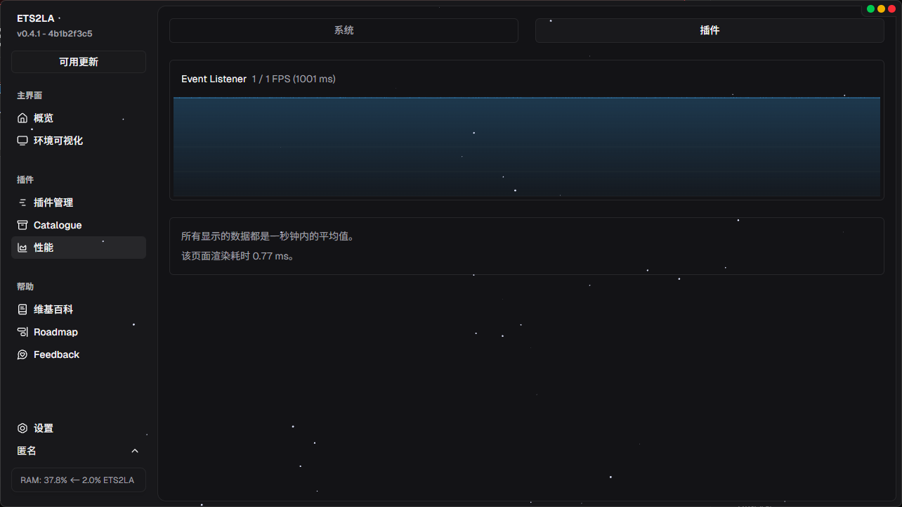 你可以在该页面可以看到ETS2LA的性能占用情况,左侧的系统表示整个ETS2LA目前所占用的CPU和内存,而右侧的插件选项可以看到每个已启用插件的帧数以及延迟