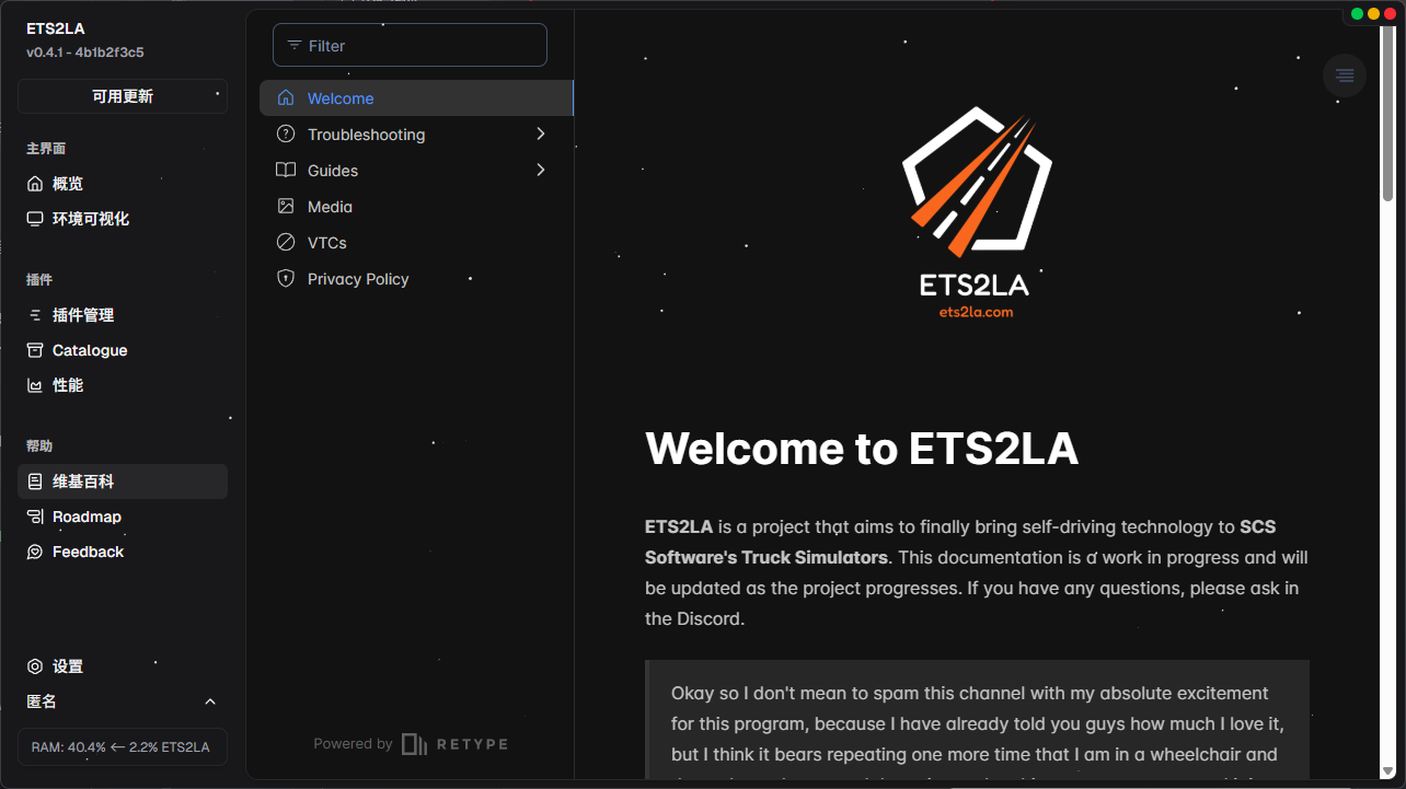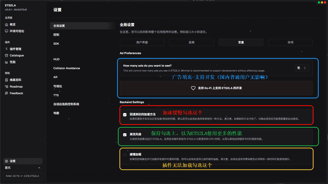 小白用户不要轻易使用该页面的内容,因为自己随意使用该页面插件所造成的后果(如ETS2LA无法打开、游戏崩溃/卡死、电脑无法上网等问题)ETS2LA中国区管理组不负责,也没有任何义务帮你解决