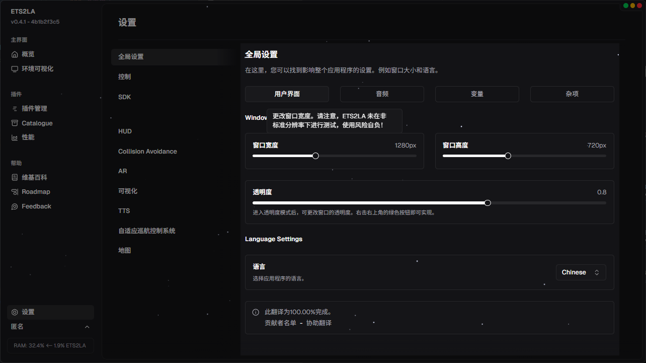 该位置的设置主要用来调整页面的大小、透明度的多少以及修改语言,ETS2LA无法通过拖动软件边框来实现大小的调整,只能通过设置里面进行调整