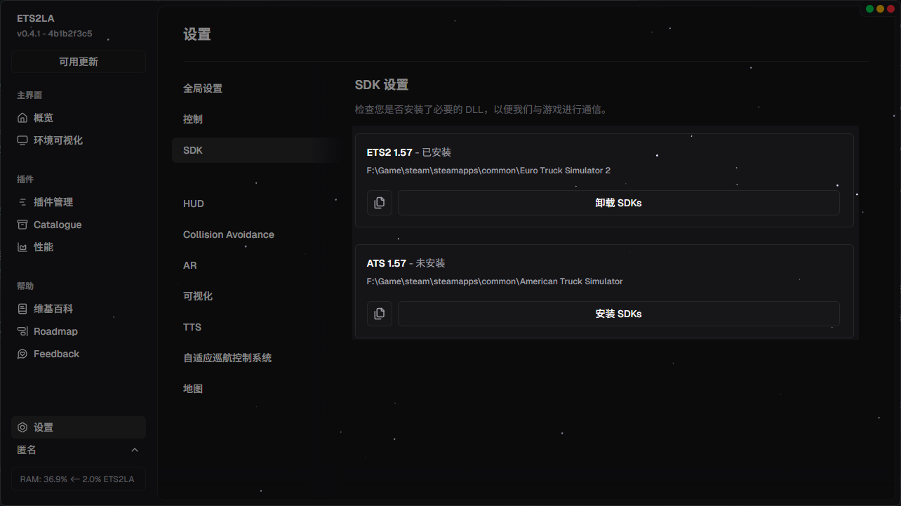 ETS2LA整个程序都是基于SDK来运行,没有SDK就无法获得任何游戏内的行为,也无法发送任何行为到游戏内,这一步在基础使用里面已经有过了;如果你想要卸载ETS2LA你需要先卸载SDK然后再运行卸载程序
