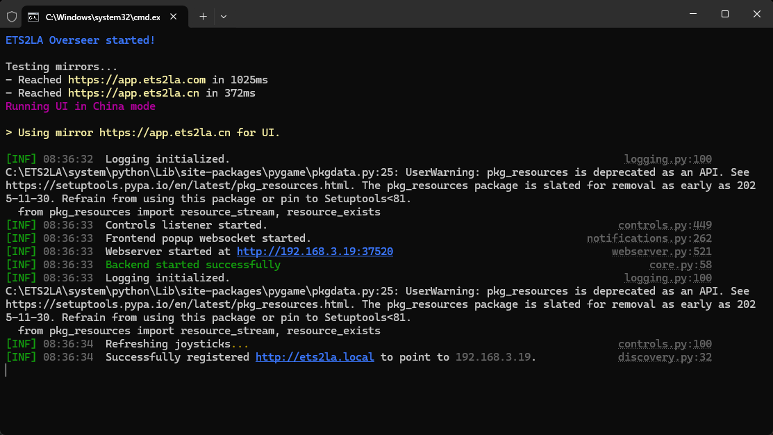 双击打开位于桌面的ETS2LA图标或位于安装目录中的start.bat文件;打开时会同时启动控制台(目前无法关闭),稍作等待之后会弹出UI页面; 你看到的控制台应该是这样的