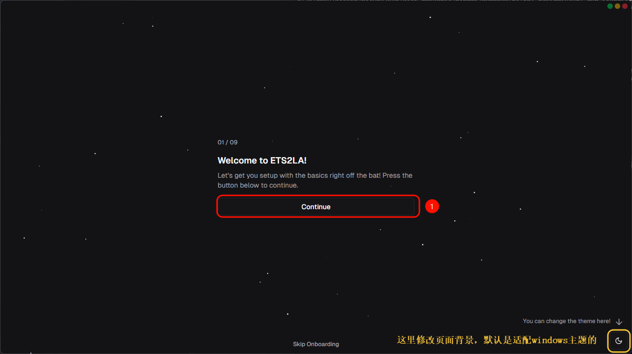 新手引导总共分为9步,接下来我们来一步一步的完成新手引导 在新手引导的首页是一个欢迎页,点击Continue进入到下一个步骤