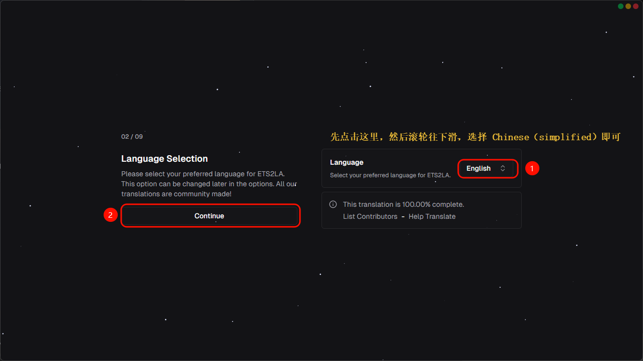 第二页是语言选择,在这个页面选择你希望以什么语言来使用ETS2LA,目前ETS2LA支持多种语言,这些语言都是由社区进行翻译的,各语言的翻译进度可在ETS2LA Translations中查看