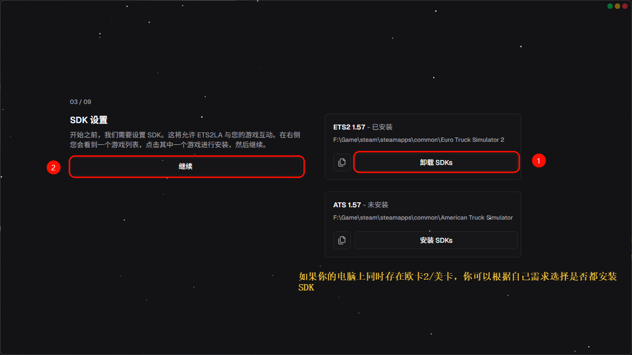 第三页是安装SDK,软件会自动搜索电脑上已经安装的欧卡2/美卡并列出安装路径,你只需要点击安装SDK按钮即可完成SDK的安装;安装完SDK之后会才出现继续的按钮,不安装则不能继续