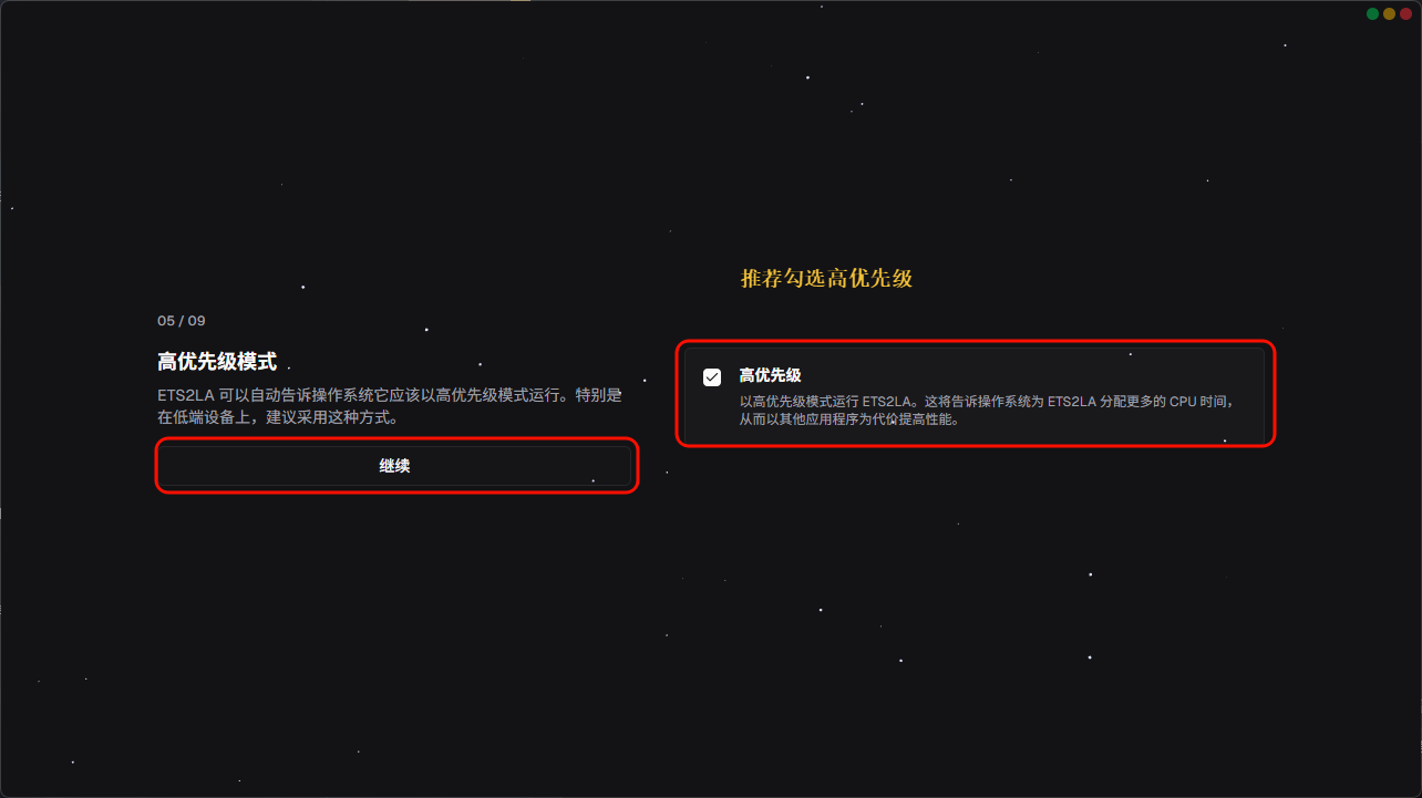 第五页就是设置高优先级,这里推荐开启高优先级,让ETS2LA使用更多的CPU性能
