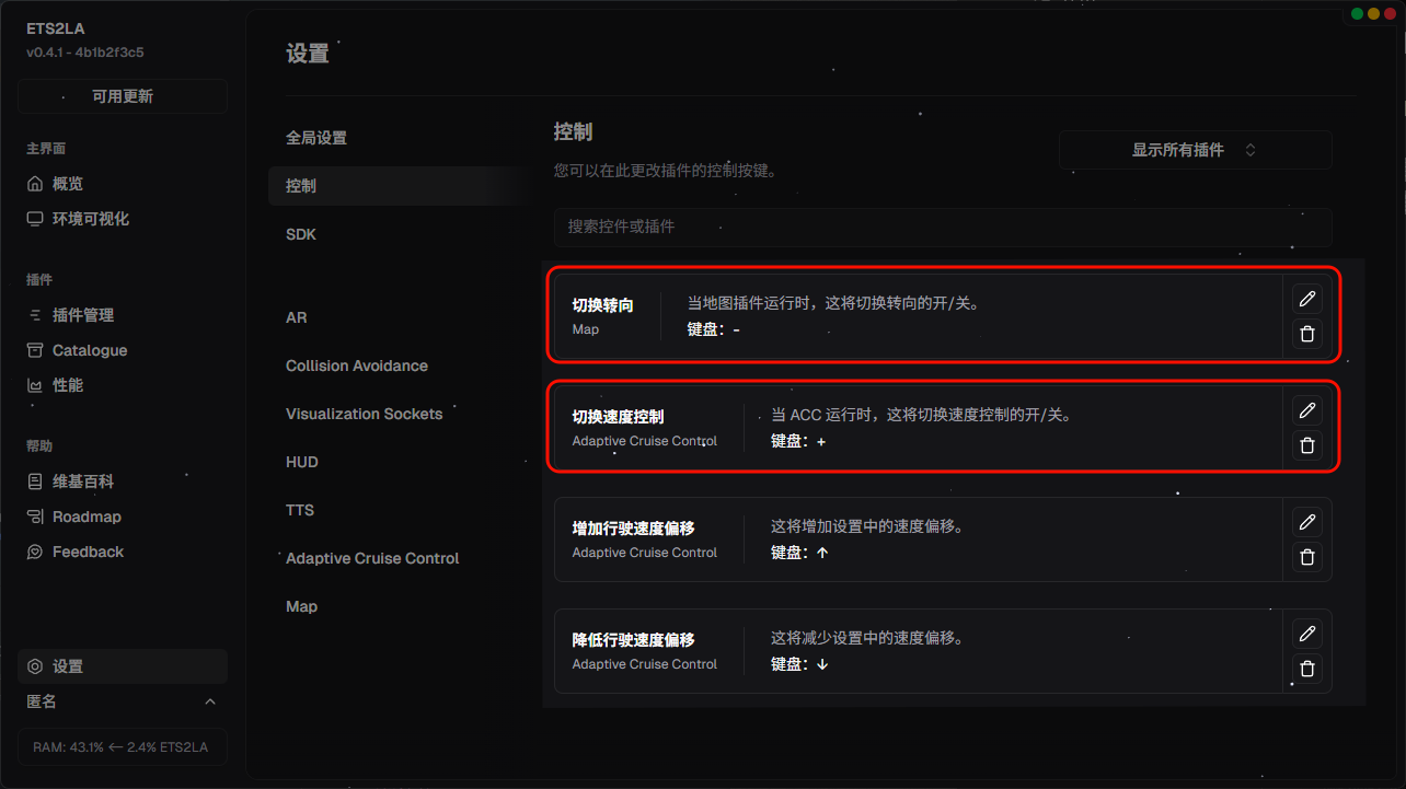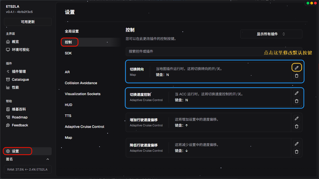 在使用ETS2LA之前为了防止出现只加速不转向/只转向不加速的情况我们要先去修改一下按键设置;先点击设置,然后选择控制,在切换速度控制和切换转向中的选择任意一个,点击后面的铅笔✏️按钮,然后按键盘上你想要的按键即可