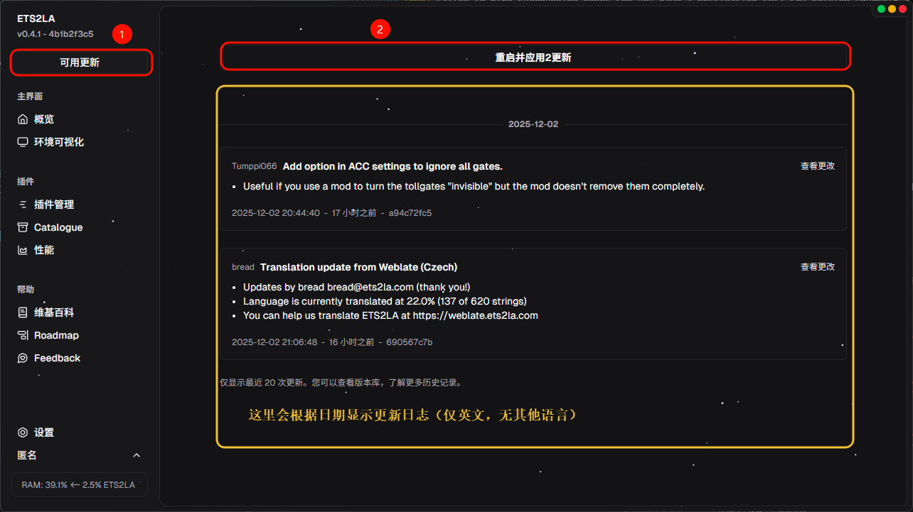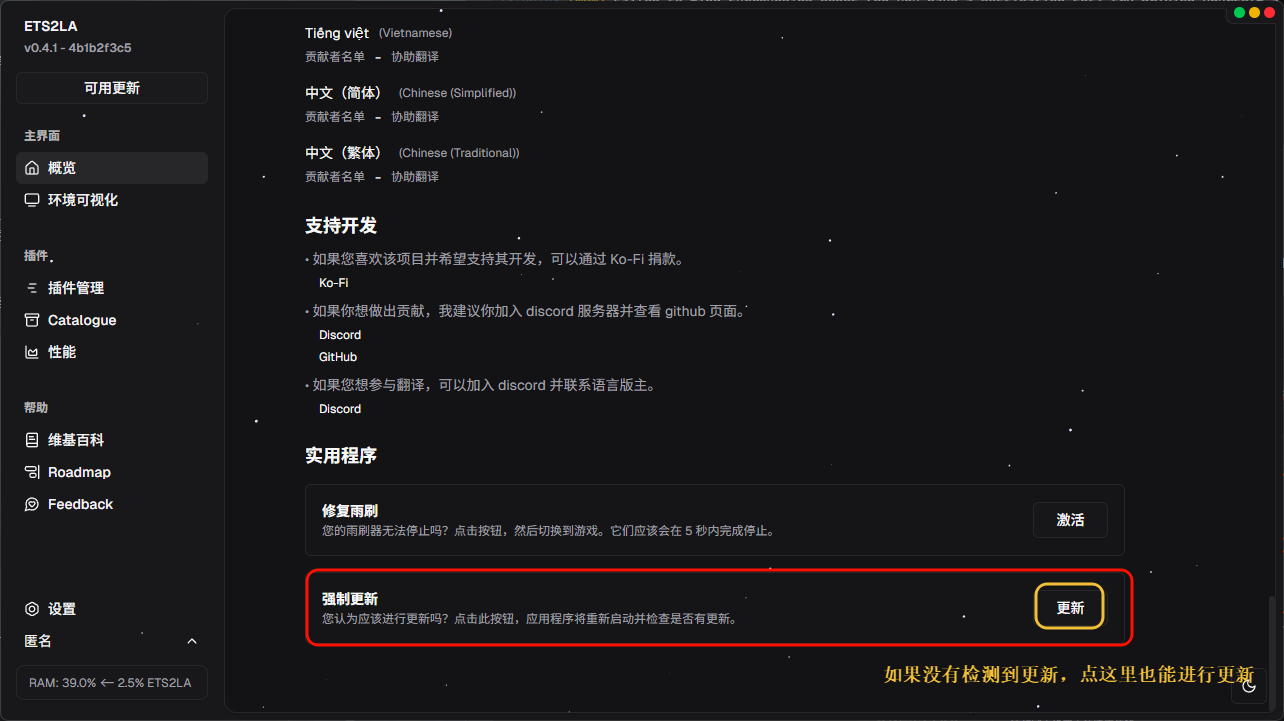 由于软件仍在开发中,所以及时更新软件就显得极为重要,ETS2LA的更新总共分为四总方式,分别为软件内和软件外