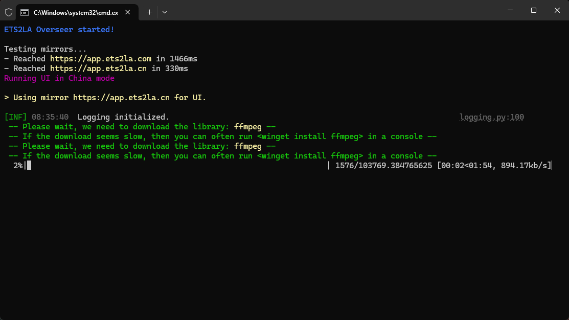 由于软件需要从远程服务器下载ffmpeg,但是因为ffmpeg的服务器的并不在国内,所以会出现下载失败的情况;为了确保软件能够正常运行,我们建议使用手动添加的方式来安装ffmpeg;从ETS2LA国内镜像下载站下载压缩包,将其解压出来,将里面的ETS2LA文件夹复制到ETS2LA的安装目录/盘符中即可,这样在稍后启动ETS2LA的时候就不需要下载ffmpeg也不会弹出错误提示了。